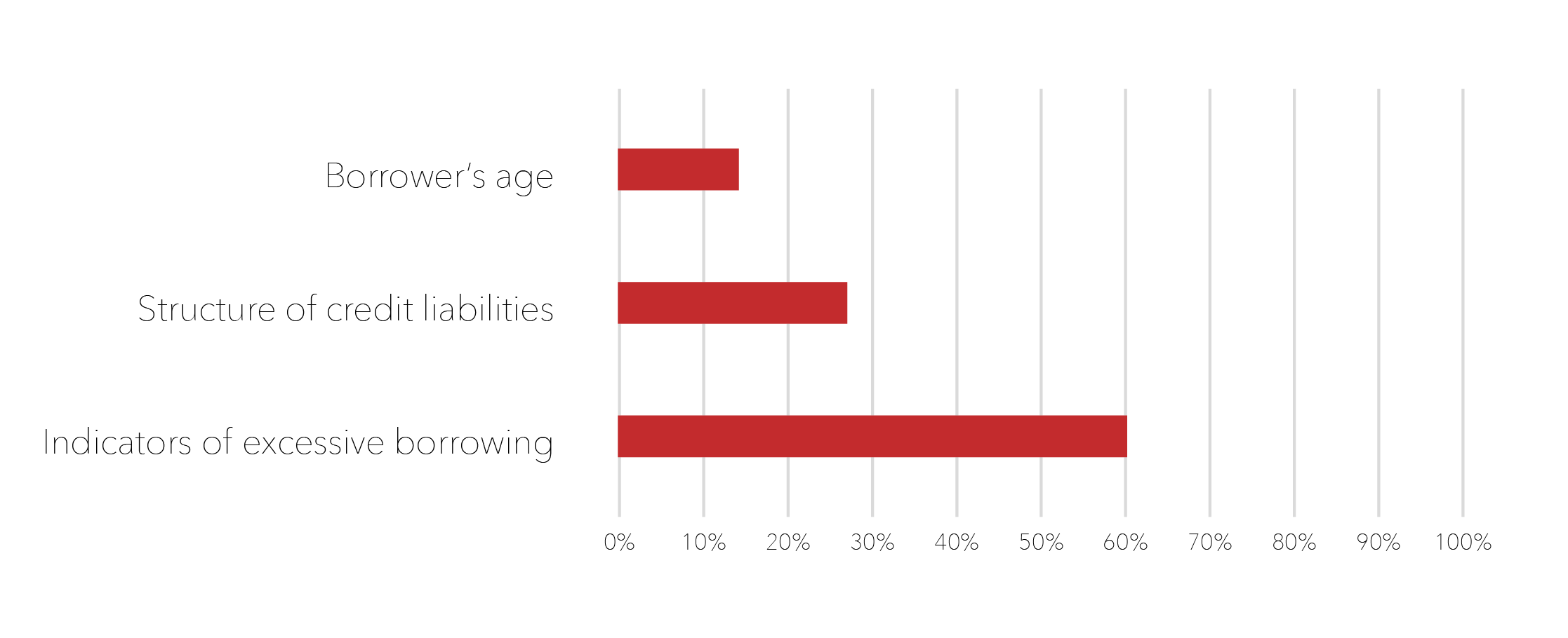 Indicators of excessive borrowing – indicators such as several consumer loans to different lenders, the frequency of late payments, requests from remote lenders in a short period of time, overdue liabilities guaranteed by the borrower, past liabilities paid with delays or assignments, taxes and utilities debts, relationships with companies (as a board member or owner) which have significant payment delays, etc. are some of the indicators.