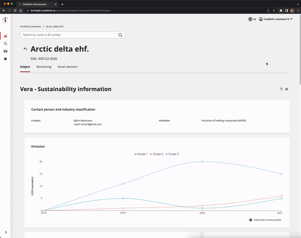 To address this growing need for ESG data services Creditinfo Iceland recently launched Vera, a new ESG data platform, for customers in Iceland. With Vera companies can access data about their customers and/or suppliers in an accessible way. The platform contains diverse sustainability information for all active companies in Iceland including data directly reported by companies as well as external sources such as media coverage, judicial information, and supply chain operations. Companies can easily update their own sustainability information through MyCreditinfo to ensure an accurate portrayal of information such as emissions, ESG ratings, and other relevant data.